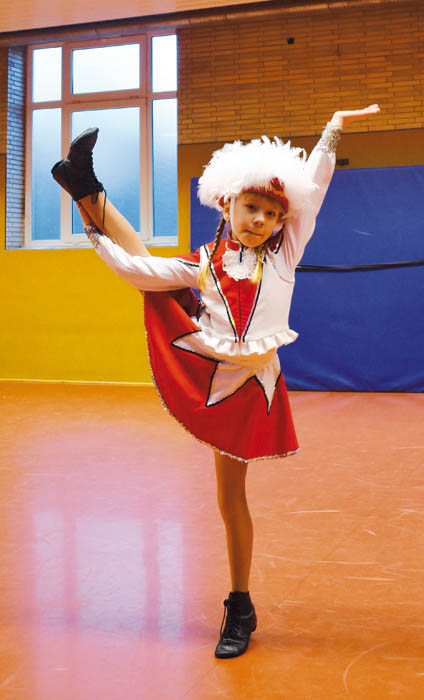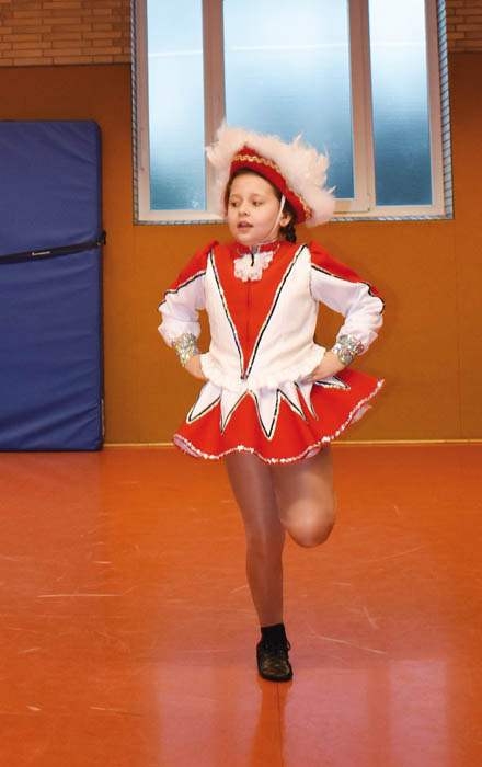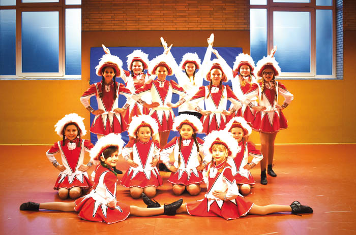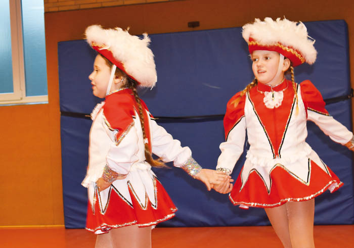 »Deshalb ist es so wichtig, sich ordentlich warmzumachen und zu dehnen, um sich nichts zu zerren«, weiß Cornelia ›Conny‹ Straßmann. Die Vereinspräsidentin hat selbst jahrelang getanzt, erreichte 1972 mit der gemischten Garde den achten Platz bei den Deutschen Meisterschaften. »Bei den Kleinsten ab vier Jahren geht es natürlich noch etwas spielerischer zu. Aber bei den Größeren ist echter Ehrgeiz vorhanden. Die haben rote Gesichter, wenn sie aus der Turnhalle kommen.« Umso mehr, weil bis zum großen Jubiläumsauftritt Anfang März in der Europahalle vor hunderten Zuschauern jede Figur sitzen soll. »Unsere Minis werden dort zum ersten Mal einen klassischen Gardetanz vorführen und sind deshalb schon ganz aufgeregt.« (Anmerkung: Im Gegensatz zum Showtanz, bei dem unterschiedlichste fantasievolle Kostüme erlaubt sind, schreibt das Reglement beim Gardetanz traditionelle Kostüme in den Vereinsfarben mit Hut vor.)
