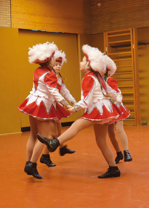 Beinwerfen, Radschlag, Spagat: Für den Laien ist es schon verblüffend, was die jungen Funkenmariechen in ihren rotweißen Kostümen da abliefern. Im Hintergrund laufen flotte Dance- und Musical-Rythmen. Auf Polonaise und Schunkellieder wartet man beim Juniorentraining des ›CCCS Rot-Weiß 1959 e.V.‹ hingegen vergebens. Der karnevalistische Gardetanz: ein ambitionierter Hochleistungssport mit akrobatischen Elementen.