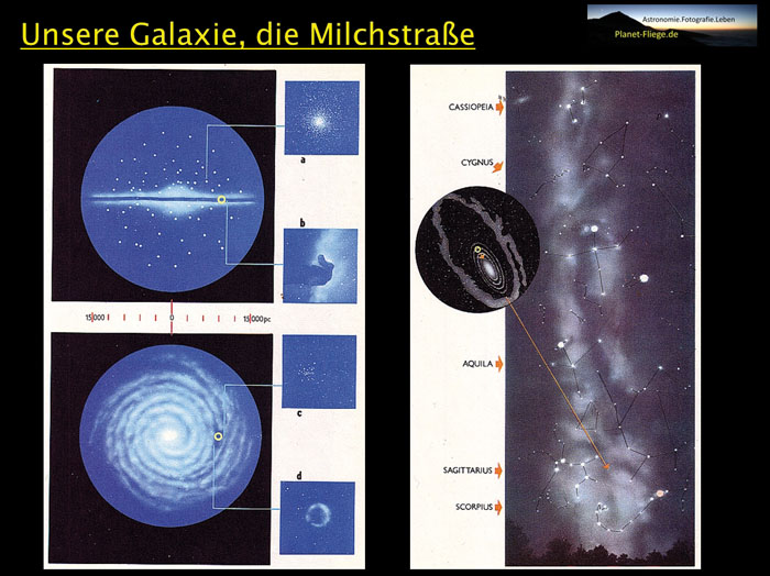 »Die Milchstraße ist eine Galaxie: ein sich drehender Knubbel, bestehend aus Milliarden von Sternen, der Spiralarme hinter sich herzieht. Ihre Form – es handelt sich um eine flache Scheibe mit breitem Durchmesser – erinnert an einen Diskus. Die Erde sitzt nun innerhalb dieser Galaxie, auf einem Spiralarm zwischen dem knubbeligen Zentrum und dem Rand. Was wir von unserer Position aus sehen, wenn wir in die ›Diskusebene‹ schauen, ist die Milchstraße: ein helles Band am Nachthimmel. Außer unserer gibt es natürlich noch viele andere Galaxien, aber die meisten sind weit weg und nur schwach erkennbar.«