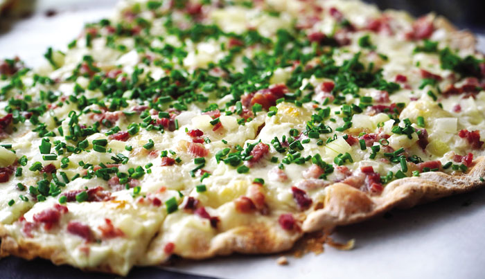 Schnittlauch fein hacken, den Flammkuchen damit verzieren und heiß servieren.