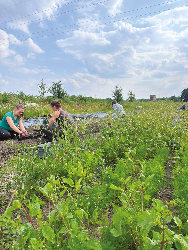 Stefanie Haake gärtnert mit: »In meinem kleinen Garten zu Hause ist zu wenig Platz für Gemüse, und gemeinsam macht es sowieso mehr Laune!« David Coerdt erzählt: »Im März hatten wir schon beim Pflanzen des Weidendoms viel Unterstützung.« Gemeinsam mit Fabian Ribbert und Rico Ziegenfuß und mit Unterstützung der Gärtnerei Drippe hat er in diesem Jahr am Biohof Dickhöfer das Permawerk gestartet. Nun beliefern sie neben dem Allmende-Acker auch weitere Kunden und Kundinnen mit Pflanzen und Gemüse aus ihrem Marktgarten – natürlich klimaschonend mit dem Fahrrad. So fördert die Allmende neben ihrer Bildungs- und Öffentlichkeitsarbeit auch die klassische landwirtschaftliche Genossenschaftsidee: Gegenseitige Unterstützung bringt alle weiter. Und so wollen sie gemeinsam Boden gut machen.