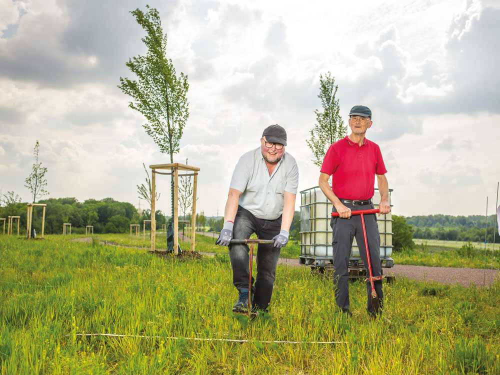 Dafür wird noch viel Arbeit nötig sein, doch zum Glück ist Tina Krachten nicht allein: Denn hier, im Natur- und Wasser-Erlebnispark an der Stadtgrenze zwischen Castrop-Rauxel und Recklinghausen, ist ein Mitmach-Weinberg entstanden. »Das Konzept hat die Emschergenossenschaft bereits sehr erfolgreich in Dortmund-Barop erprobt, und wir sind sicher, dass es auch hier gut gelingen wird. Der Zuspruch ist jedenfalls groß«, freut sich die Winzerin, die auch den Baroper Weinberg seit einigen Jahren betreut. Und wirklich sind bereits zum ersten Mitmachtermin vier Freizeit-WinzerInnen mit von der Partie, um gemeinsam die jungen Pflanzen mit Verbissschutz und Pflanzstab für eine ertragreiche Zukunft fit zu machen. Anschließend wird noch bei einem erfrischenden Getränk im Schatten fröhlich geschnackt. Mit dabei ist Uwe Schuhmann aus Recklinghausen, seit einem Jahr Mitglied in der Allmende: »Mich begeistert die Idee, hier vor Ort etwas umzusetzen, das gut für Menschen und Umwelt ist.« »Hier können Menschen selbst erleben, was gesunde Böden und ein intaktes Ökosystem ausmacht, und lernen, wie man sie fördert – und dabei direkt mitmachen und es auch genießen«, erklärt Winzerin Tina Krachten, selbst im Vorstand der Allmende.