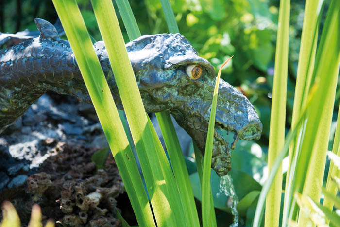 Überraschend fein gearbeitet sind auch die Gestalten aus Kupfer und Messing, denen Ulrich Fehring in mühsamer Handarbeit märchenhaftes Leben eingehaucht hat. Jedes einzelne dieser bezaubernden Schwergewichte wurde über der offenen Flamme geschmiedet, mit verblüffendem Ergebnis: hier ein Troll, dessen Mantel scheinbar Falten wirft und an dessen Stiefeln sogar die Nähte erkennbar sind, dort ein geflügeltes Untier, das zwar statt Feuer Wasser speit, aber in der grünen Umgebung des Gartens ziemlich real wirkt. »Ich habe jede einzelne Schuppe ausgeschnitten und verlötet.« Der Schöpfer schmunzelt: »Viele Besucher erschrecken vor den Augen – es handelt sich tatsächlich um lebensechte Glasaugen.«