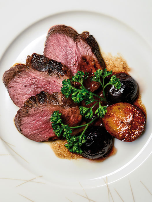 Das Fleisch mit der Fettseite nach unten in eine kalte Pfanne legen und bei starker Hitze anbraten, bis die Fettschicht goldbraun wird (3–4 Minuten). Danach wenden und ca. 1 Minute auf der anderen Seite braten.