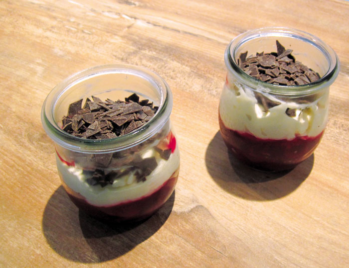 Vier Gläser zu gut der Hälfte mit roter Grütze füllen. Die Sahne mit dem Vanillezucker steif schlagen, Mascarpone dazugeben und gut verrühren. Die Sahne-Mischung auf die Rote Grütze schichten. Zum Schluss mit Schokoladenraspeln bestreuen, bis von oben keine Creme mehr zu sehen ist.