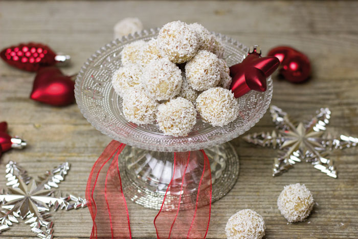 Sahne steif schlagen, Sahnesteif untermengen. Restliche Zutaten dazu mischen. Biskuit zerbröseln und ebenfalls unter die Creme mischen. Aus der Masse kleine ›Schneebälle‹ formen und diese in Kokosflocken wälzen. Zum Tee servieren.