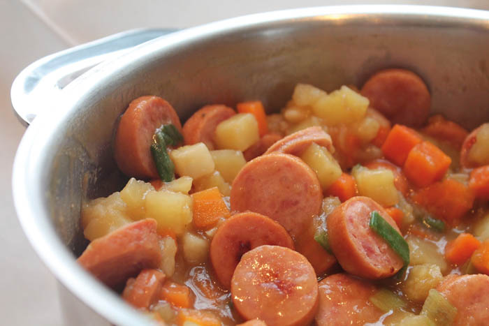 In dieser Zeit die Würstchen anbraten, in Stücke schneiden und dazugeben. Den Eintopf mit Senf, Sahne, Salz, Pfeffer und Zucker abschmecken.