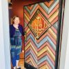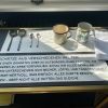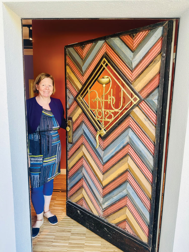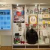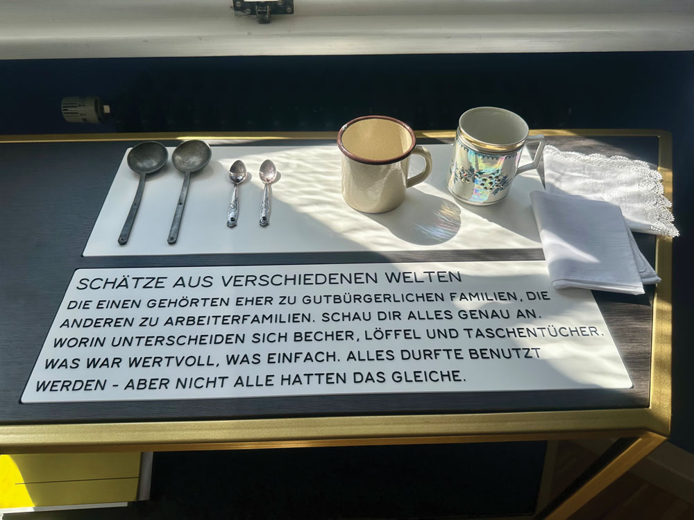 Vom Foyer aus gelangen wir über einen Korridor in den benachbarten Altbau. Dort erblicken wir ein architektonisches Juwel: die originale Eingangstür der Villa Urbahn von 1925. Heute steht sie ausnahmsweise offen und wir können den Messingbeschlag an der Außenseite bewundern: die Initialen HU für Hermann Urbahn und die Äskulapschlange als Symbol der Heilkunde. Die Farbgestaltung – hellblau, altrosa und goldbraun – setzt sich in den Themenräumen der Dauerausstellung fort. Das erste Zimmer stellt traditionelle Lüner Unternehmen und ihre Erzeugnisse vor: ein gusseiserner Ofen, eine elegante Parfümflasche, die Buttermaschine ›Immerflott‹. BesucherInnen können Arbeitskleidung anprobieren und den Stimmen von echten Menschen lauschen, die aus ihrem Berufsleben berichten.