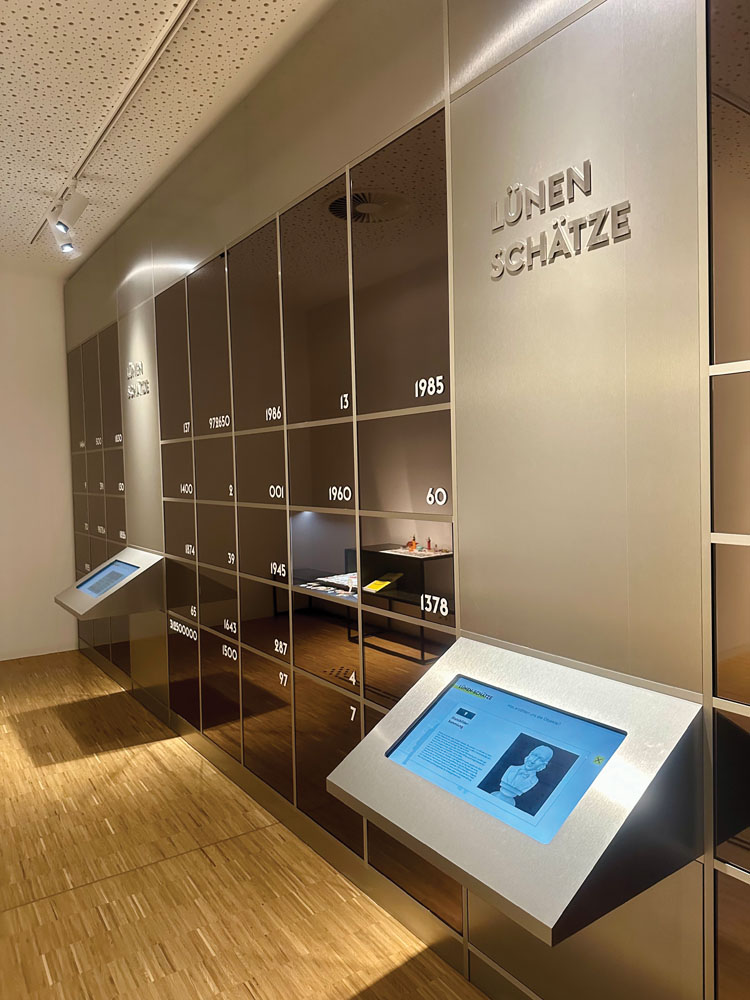 Schon beim Betreten fällt ein raffiniertes Detail ins Auge: Die Schließfächer tragen keine Nummern, sondern Namen bekannter Persönlichkeiten samt kurzer Erläuterung. So lernen wir noch vor Beginn der eigentlichen Ausstellung, dass der Bergmann Bernhard Falk geologischer Sammler und Mitbegründer des Lüner Museums war. »Es ist heutzutage nicht mehr so, dass man die Türen aufschließt und das Bildungsbürgertum strömt herein«, sagt Dr. Katja Stromberg mit einem Augenzwinkern. »Man muss kreativ werden, um die Menschen zu erreichen. Deshalb finden Sie bei uns keine langatmigen Texttafeln. Wir setzen auf kurze, klare Infos, Videostelen und Stationen zum Anfassen.« Unser Rundgang startet im Foyer, das mit Loungemöbeln und einer Kinoleinwand ausgestattet ist. »Bis hierher darf man auch seinen Kaffee vom Automaten mitnehmen«, so Dr. Katja Stromberg. Eine gute Nachricht für alle, die gemütlich verweilen und einen von fünf Kurzfilmen anschauen wollen.