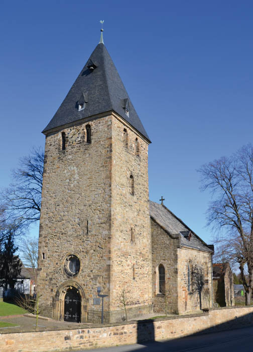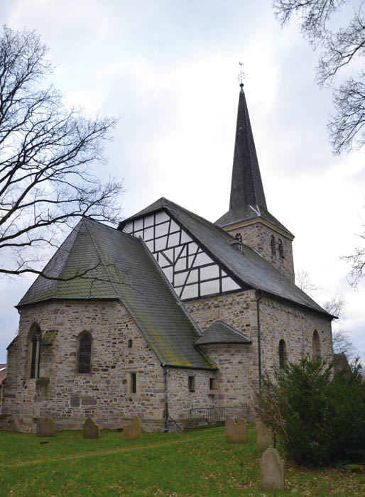 Ihren romanischen Charakter behielt auch trotz der vielen Umbauten und Veränderungen über die Jahrhunderte die ›Alte Kirche‹ in Dortmund Wellinghofen (Abb. 3) – ein sakrales Kleinod der Region. Neben einem Freskofragment sind auch eine romanische Seitenapsis, ein romanisches Fenster und der Taufbrunnen (Abb. 4) aus den Anfängen des Kirchenbaus erhalten. Im Kirchturm läutet übrigens bis heute immer noch eine Glocke, die im 13. Jahrhundert gegossen wurde.