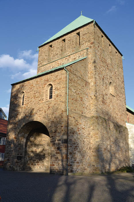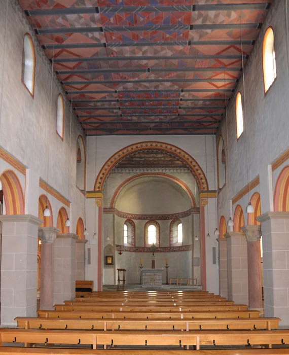 Einen Besuch wert ist die lange Zeit als älteste Pfarrkirche nördlich der Alpen geltende Luciuskirche in Essen-Werden (Abb. 5). Die Architektur der flachgedeckten Basilika imponiert als wehrhafter Bau mit kleinen Rundbogenfenstern, was insbesondere durch den wuchtigen, geradezu festungsartigen und quadratischen Westturm und die vorgelagerte Vorhalle betont wird. Im Inneren gliedern runde und eckige Säulen das dreischiffige Langhaus, eine Säulenanordnung, die für die rheinische Romanik typisch ist (Abb. 6).