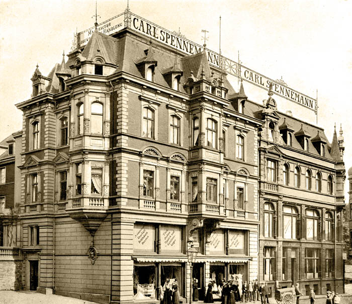 Dann aber geriet der Rubel ins Rollen. Schnell wurde das neue Geschäft zum Treffpunkt der Kauflustigen. Für seine »Qualitätswaren zu volkstümlichen Preisen« war es weit über die Stadtgrenzen hinaus bekannt. Neben Aussteuerwaren und Textilien für Damen und Herren bot das Kaufhaus seinen Besuchern auch »ein warmes Plätzchen am rotglühenden Ofen«, wie es in der Festschrift zum 175. Jubiläum geschrieben steht. »Zum damaligen Dienst am Kunden gehörte im Hause Spennemann eine Tasse Kaffee und Zwiebäcke oder ein Gläschen Rotwein, und manch vertrautes Gespräch wurde während des Kaufens mit dem Kunden geführt.« A. Spennemann, der sich auch privat für das kulturelle Leben in seiner Stadt engagierte und ganz nebenbei 1848 die ›Wittener Turngemeinde‹ ins Leben rief, legte Wert auf individuelle Bedienung, Vertrauen und Freundlichkeit. Ein Konzept, das sich bezahlt machte, sodass sein Nachfolger Carl Spennemann um 1900 einen prachtvollen Neubau am Kornmarkt 2 / Ecke Hauptstraße errichten konnte.