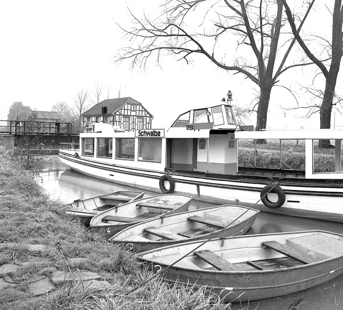 Erst im Jahre 1882 wurde schließlich die Bommeraner Brücke gebaut. Dies war aber keineswegs das Ende der uralten Fährentradition in Witten. Bis weit in die 70er-Jahre des 20. Jahrhunderts legten sich Fährmänner und auch Frauen in die Riemen ihrer Boote: Am Südufer, beim Campingplatz Steger, ruderte Wilhelm Barth, einer der letzten Fährmänner, seine Gäste hinüber zur Wetterstraße. Außerdem betrieb er einen Bootsverleih. Am (damaligen) westlichen Ende der Stadt, an der alten Schleuse, wohnte im Schleusenwärterhaus das Ehepaar Gerd und Ruth Rosendahl, sie unterhielten ebenfalls einen Bootsverleih und machten auch Fährdienst. Am Nordufer der Ruhr, bei der alten Mühle Im Sundern, wo heute die Nachtigallbrücke fußt, hörte die geradezu legendär gewordene ›Mutter Schultz‹ auf den Ruf: »Hol über!« Sie wohnte mit ihrer Familie in dem ehemaligen Mühlengebäude und Brückenhaus. Ihr Sohn Paul, am Ruhrufer aufgewachsen, wurde davon nachhaltig geprägt: Er wurde Seemann und sogar Kapitän und schließlich Schiffseigner und Kapitän der ersten ›Schwalbe‹. Nachdem er damals das Schiff erworben und auf einem Hinterhof in Annen restauriert hatte, ließ er es zur Ruhr transportieren, und genau hier, in der kleinen Bucht, wo damals sein Elternhaus stand, ließ er es zu Wasser.