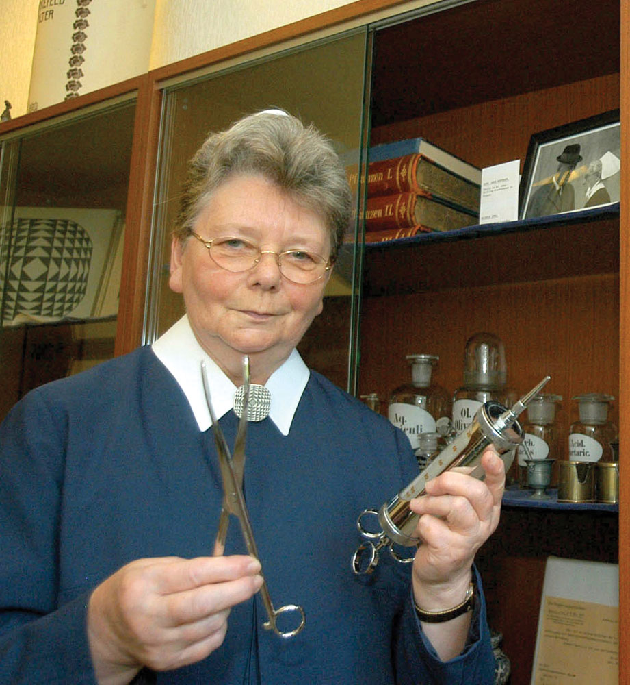 2007 gab es noch einmal einen großen Batzen zu erledigen: Die Ruheständlerin organisierte den Umzug des Hausmuseums vom Feierabendhaus ins Mutterhaus, wo nun im Untergeschoss, in zwei Räumen und auf einem Flur in Schränken und Vitrinen die Geschichte des ›Diakonissenhauses für die Grafschaft Mark und das Siegerland‹ lagert und anschaulich präsentiert wird. Zu den Ausstellungstücken aus dem geistlichen und beruflichen Leben gehören u. a. Trachten, medizinische Geräte, Gebetsbücher, Kreuze, Urkunden und sage und schreibe 5.000 Fotos. Alles fein säuberlich in einem Findbuch archiviert und aufgelistet. Natürlich bleiben die Schubläden und Vitrinen nicht verschlossen: Gerne öffnen sie ehrenamtliche Mitarbeiterinnen und beantworten die Anfragen von Theologen und Historikern, Medizinern und Pflegewissenschaftlern. Auch Interessenten aus Heimatkunde und Paramentik (= Textilien für Kirchen) kommen und forschen im Wittener Mutterhaus.