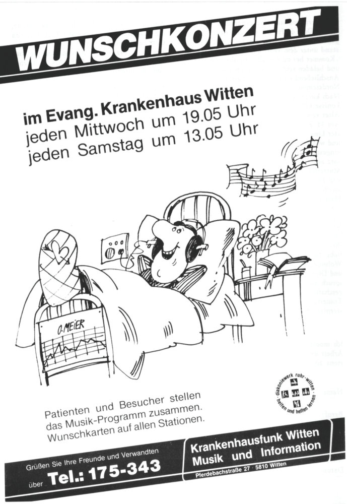 1976 nahm in Witten ein ganz spezieller Sender seine Arbeit auf – im Ev. Krankenhaus mit rund 420 Patienten. »Hier meldet sich der Krankenhausfunk mit der Sendung ›Sie wünschen – wir spielen‹«. So erklang es erstmals am 6. November 1976 in den Patientenzimmern und Aufenthaltsräumen des neuen ›Diakonissenhauses‹.